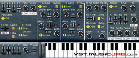 This is an enough complex synth to get unexpected results. It has complex modulation options and only 2 preprogrammed presets. For leads and agressive sounds. Version 1.81 Now with selectable Envelope Slope.