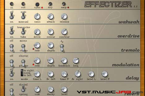 Features six popular effects: WahWah, Overdrive, Tremolo, Modulation (Chorus/Flanger or Phaser), Stereo Delay (with ping-pong option) and Reverb.