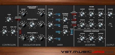 This synth is meant to be a model of the Minimoog Model D synthesizer, and a lot of time was invested to get it the way it sounds, including oscillator and filter character as well as modulation struction and response.