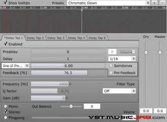 PitchedDelay è un multi-tap pitching delay (32 – 64 bit) messo a disposizione da lkjb Plugins.
