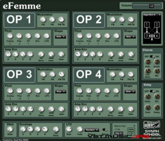 eFemme [scheda], 4 operator FM / PM synth plugin sviluppato da Synth School.