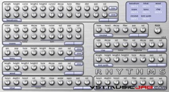 Rythms [scheda], 9 voice drum synth instrument rilasciato da Odosynths.