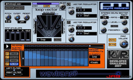Wavtransit is a VSTi loop sampler designed for manipulating longer samples and recordings to be looped and mangled with the loop vector and various sequence modulators.