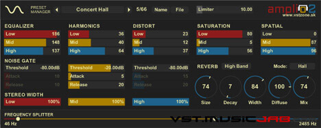 Each band has it’s own harmonics exciter, saturation and spatialization enhancer for creating pseudo 3D effect, that also work with mono source. Reverb module can by applied to ONE choosen band. 39 presets to choose. Amplio can be also used as effect/enhancer for instruments if configured correctly. Three presets as example for vocals, flute and strings.