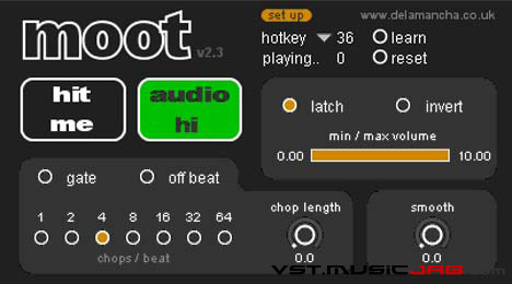 in invert mode (hold down to play audio, release to mute)The minimum and maximum volume can be set so that as well as muting, moot can act as a switch between a high and low volume In addition there is an audio gate to chop the audio and a smooth control to add a small attack/decay between changes