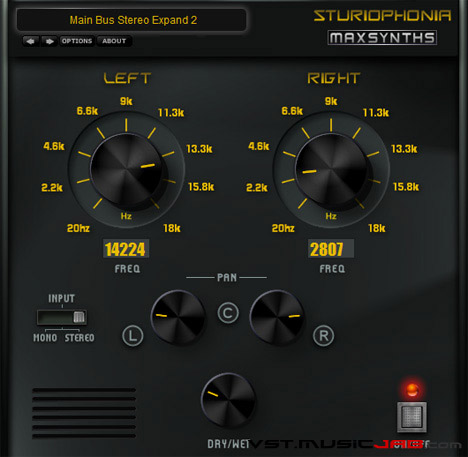 It’s important to understand that Sturiophonia works by splitting the sound frequencies for the left and right channels using different filter methods, so to achieve the best results it is advisable to experiment with it and use the right frequencies depending on the source material feeded into it.