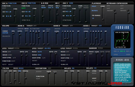 Funxion is a hybrid synthesizer with user definable functions for waveforms and distortion.