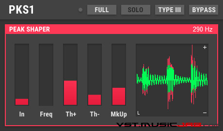 Works in full range, low-pass or high-pass filtered mode, with three types of peak shaping curve. It has double waveform scope for dry and wet signals for easy comparison.