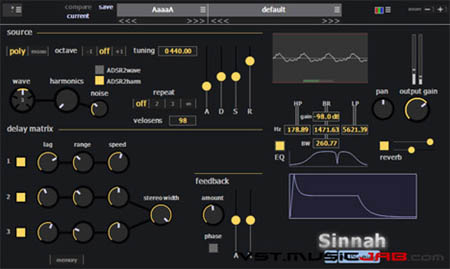 Sinnah is a VA synth plugin, but instead of the standard subtractive resonant filter it uses a resonant delay network.