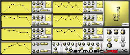 The filter has the same envelope as the operators with 7 different filter types: db12 lowpass / db24 lowpass / 36db lowpass / hipass / bandpass / 4 pole moog filter and a 8 pole moog filter.