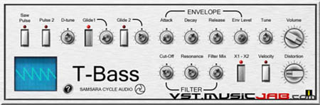 T-BASS is a single and double note bass synthesizer influenced by the Roland TB-303.